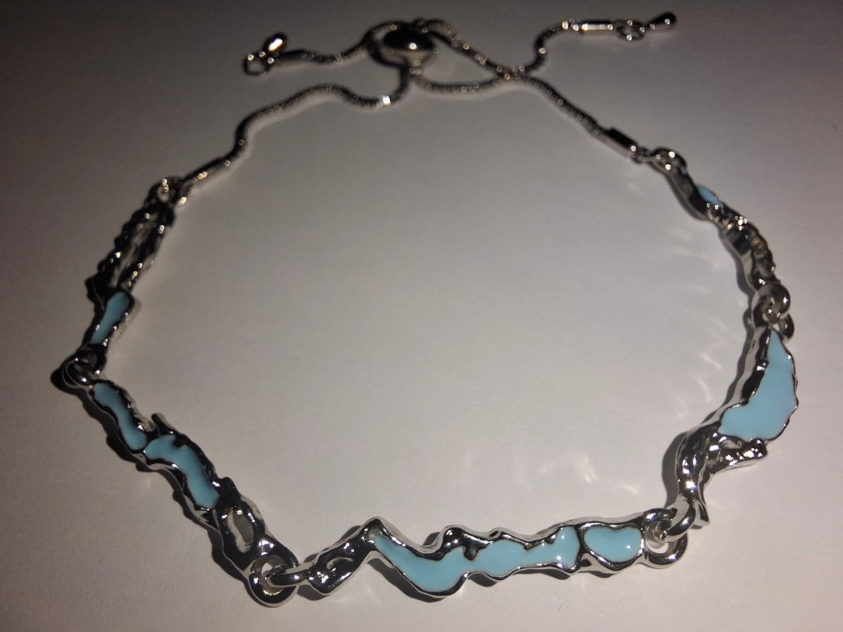 Dieses moderne Armband begeistert mit seinem abstrakten, wellenförmigen Design – wie eine stilisierte Linie oder ein Flusslauf. Die glänzende Silberoptik und das verstellbare Zugband machen es zu einem perfekten Everyday-Piece für minimalistische Styles.
