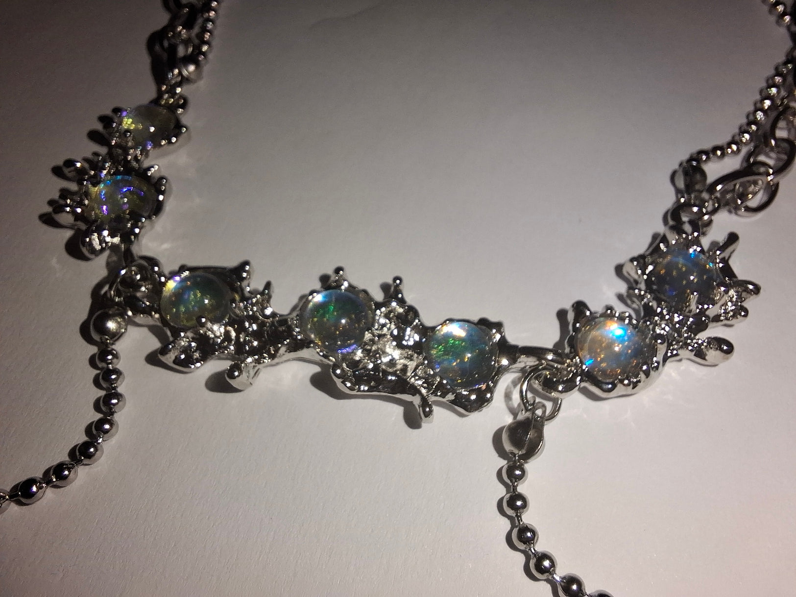 Diese extravagante Halskette mit schimmernden Opalsteinen bringt kosmische Vibes in deinen Look. Die einzigartigen Fassungen erinnern an flüssiges Metall oder kleine Sternexplosionen und verleihen der Kette eine geheimnisvolle, fast außerirdische Ästhetik.